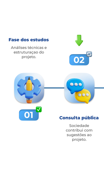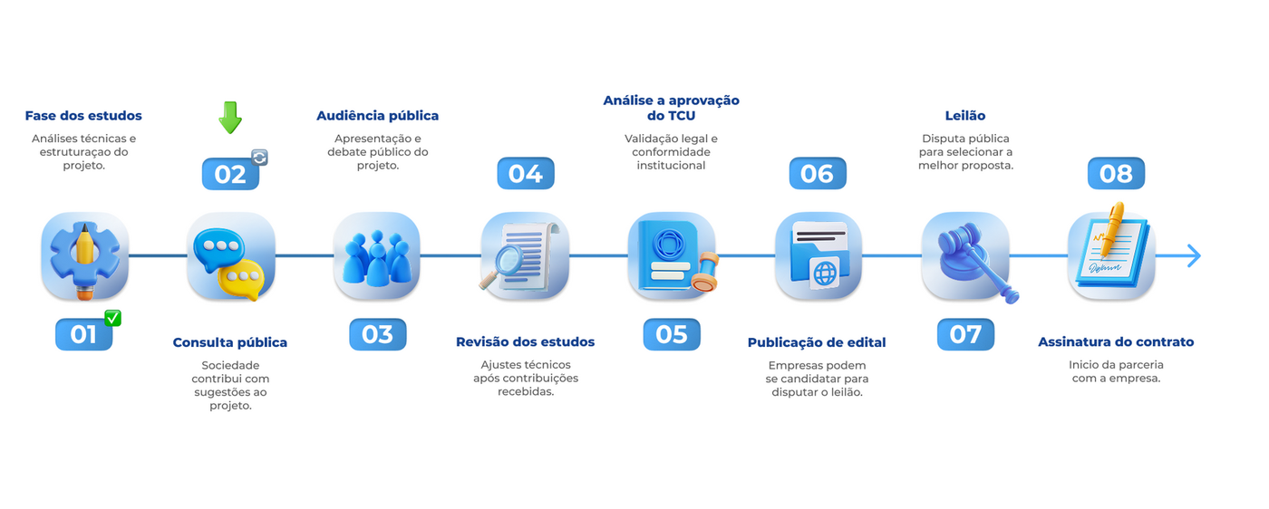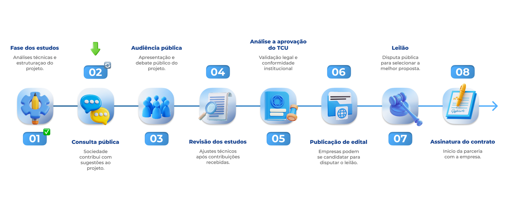 O processo de estruturação prevê etapas de consulta pública e audiência pública, visando permitir que produtores, investidores e cidadãos possam adquirir conhecimento sobre o empreendimento, esclarecer dúvidas e enviar contribuições para eventual aprimoramento do projeto.